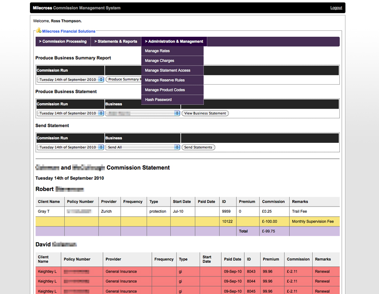 A PHP engine was designed from scratch to parse an XLS/XML data feed, provided by the network parent company. The engine was then responsible for matching and allocating each individual commission payment to its relevant advisor at a given payment rate before automatically generating and sending electronic commission statements.