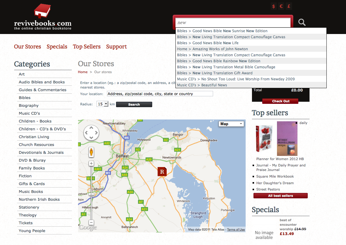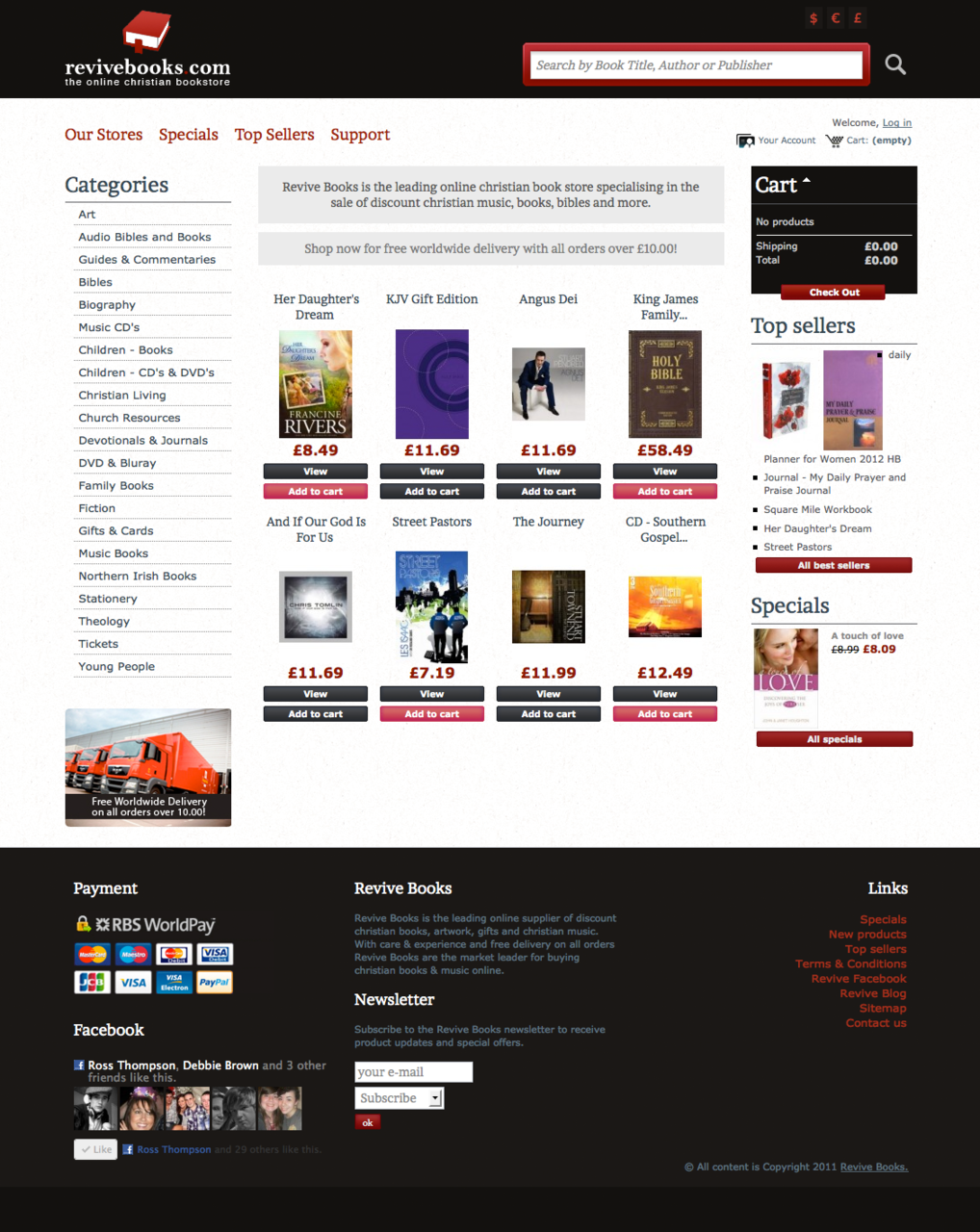 Having established a successful high street store, Revive made the decision to establish themselves as an online retailed in Christian Books. For this project a Prestashop installation was deployed with a custom graphical theme designed using Adobe Photoshop CS 4.